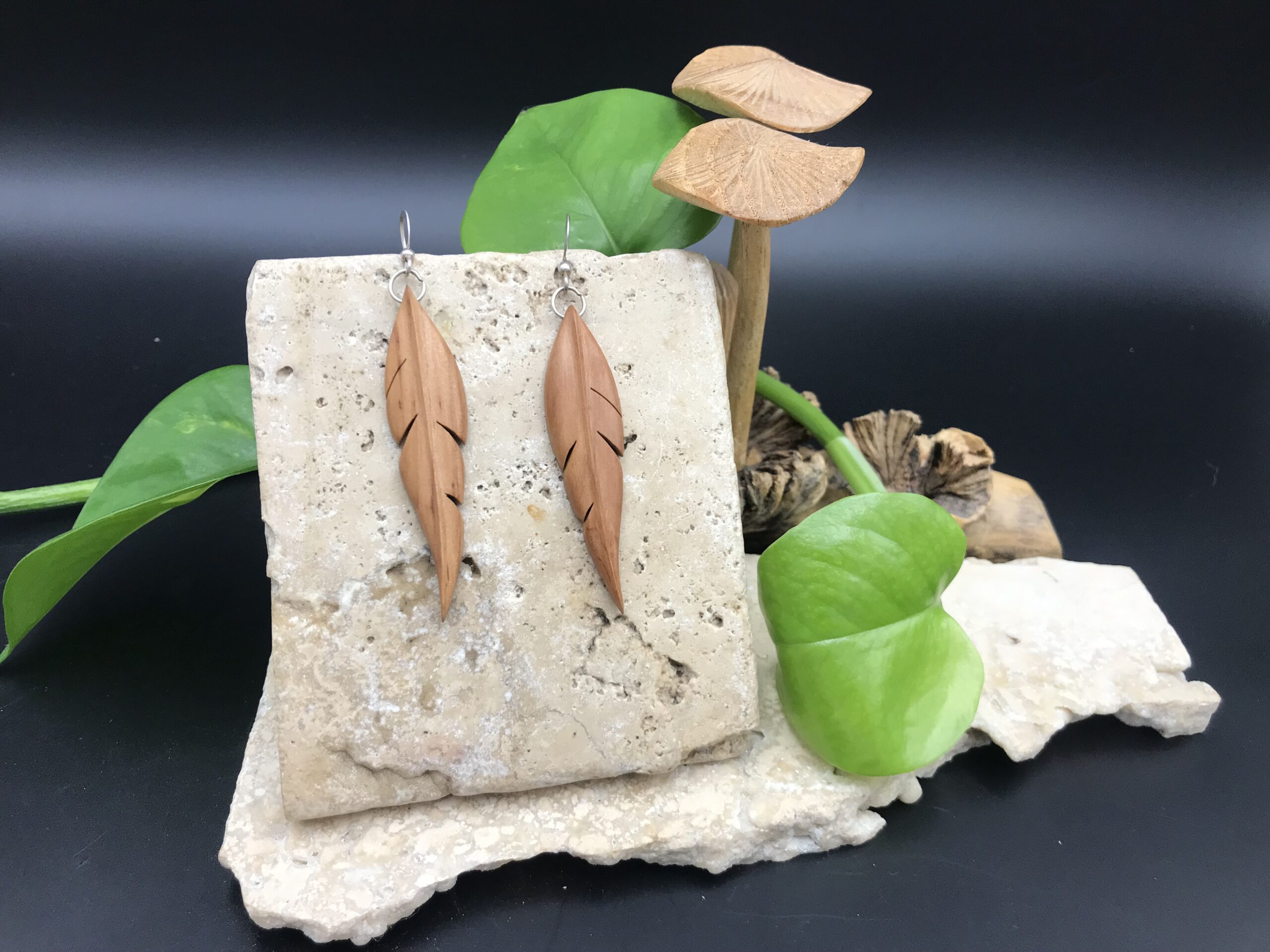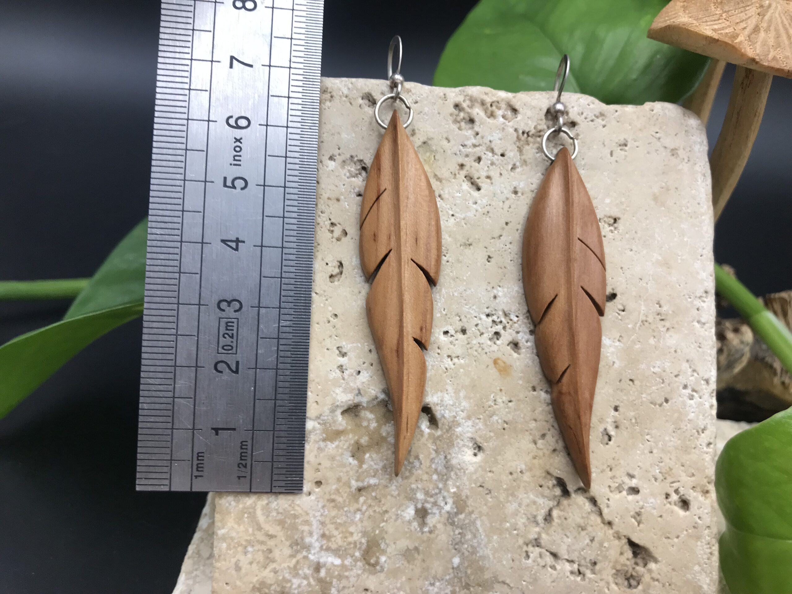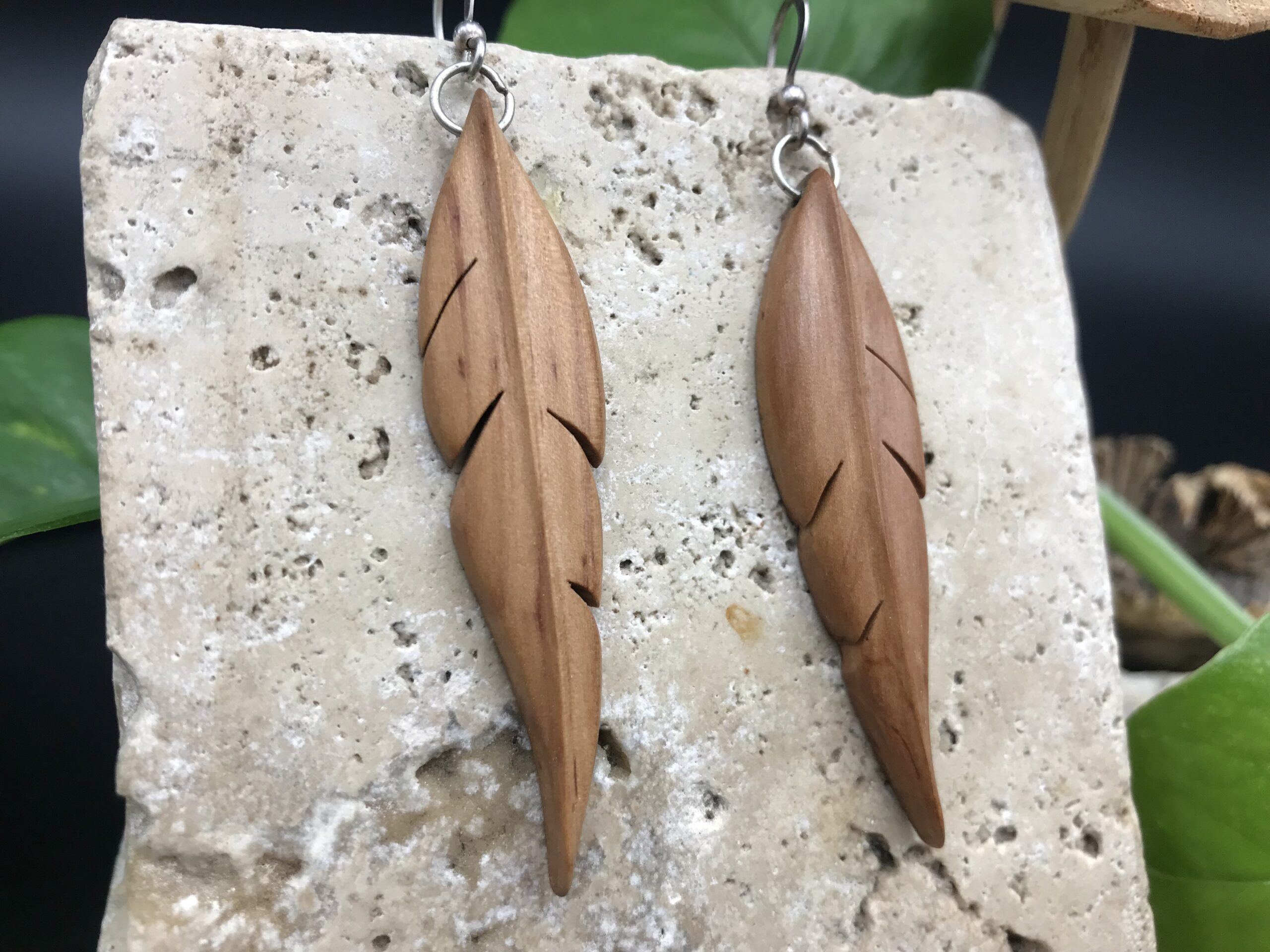 Ces boucles d’oreilles sont fabriquées à partir de bois de récupération, elles ont été découpées à la main au bocfil et sculptées au Dremel.