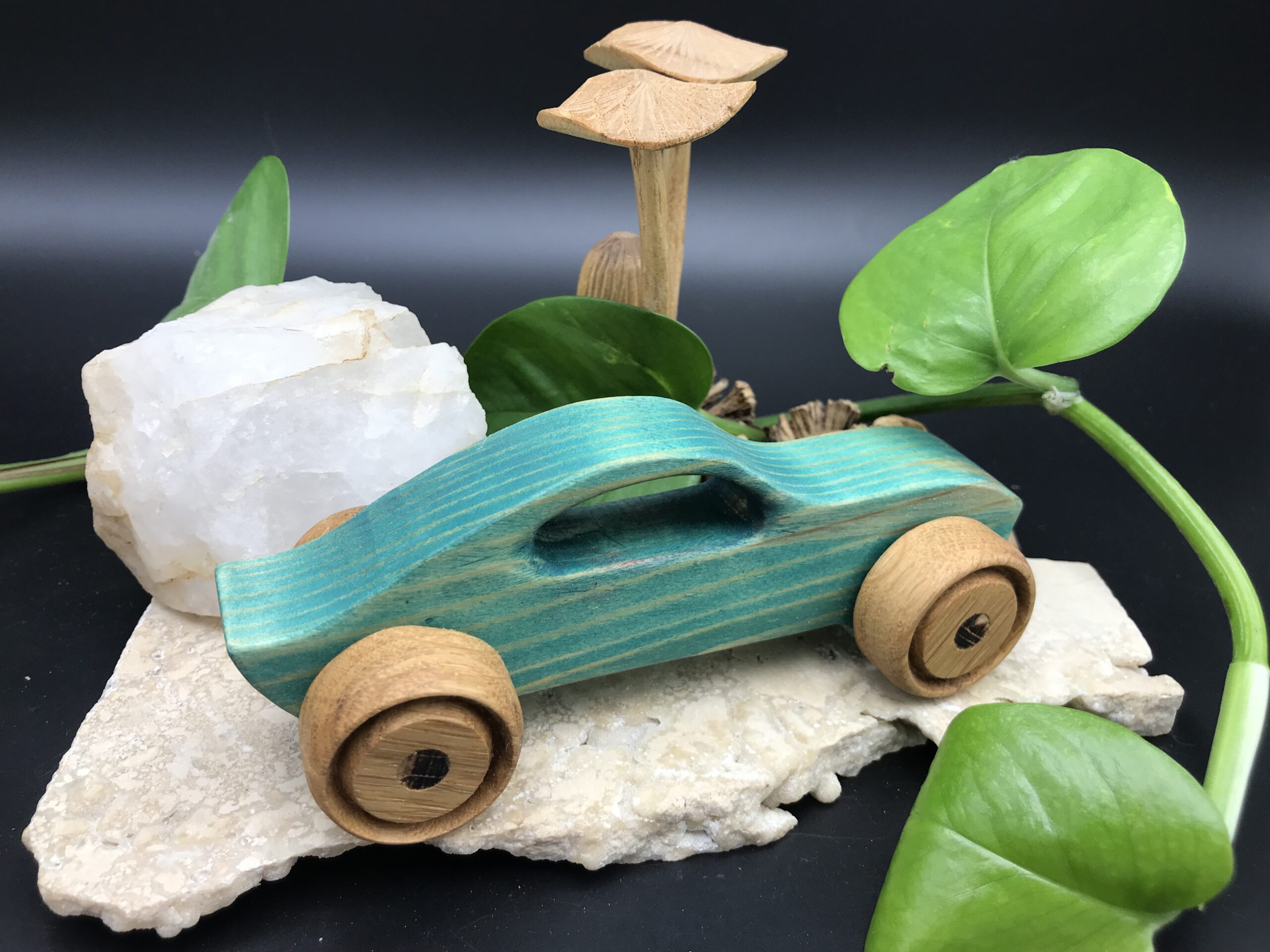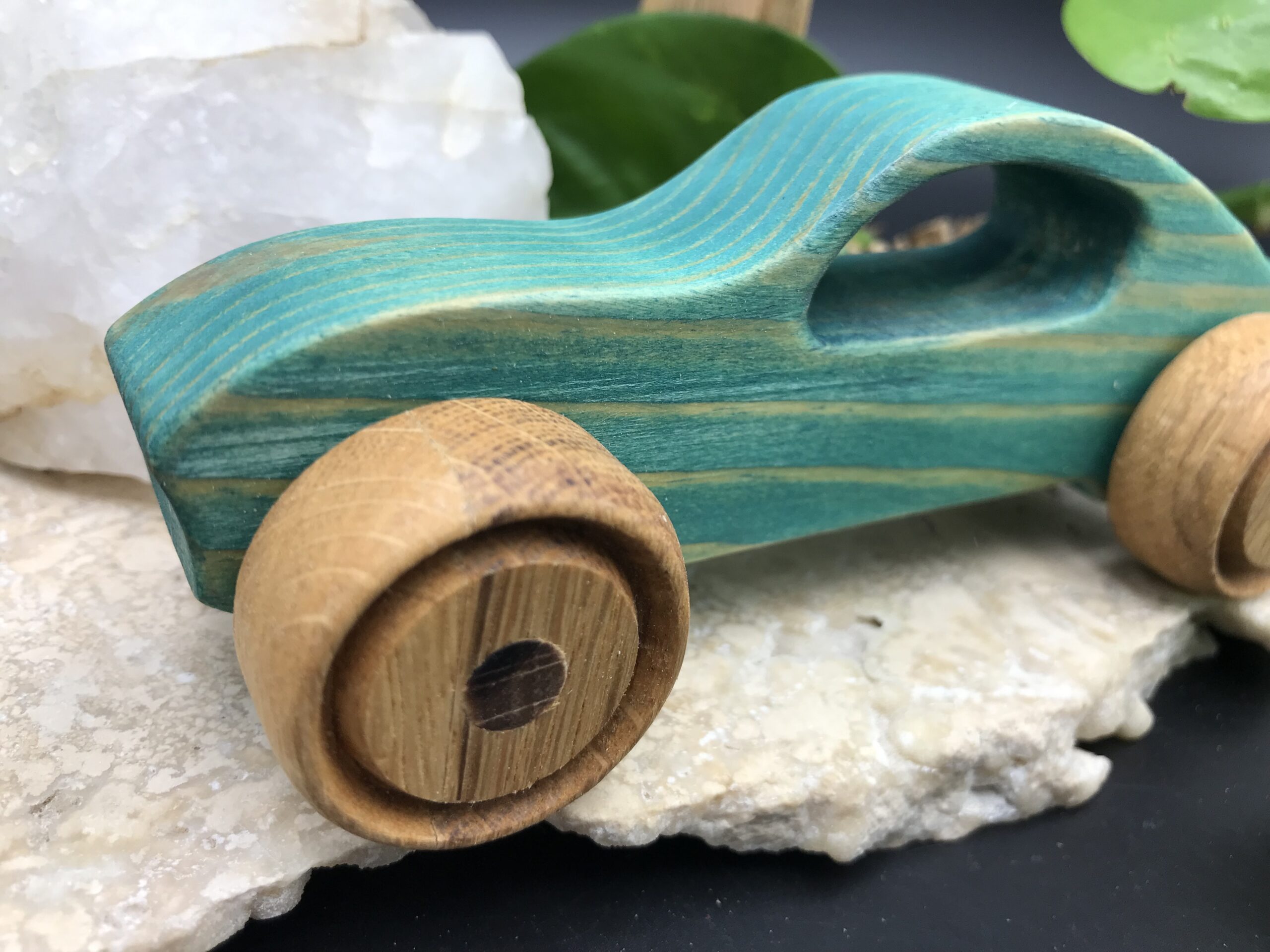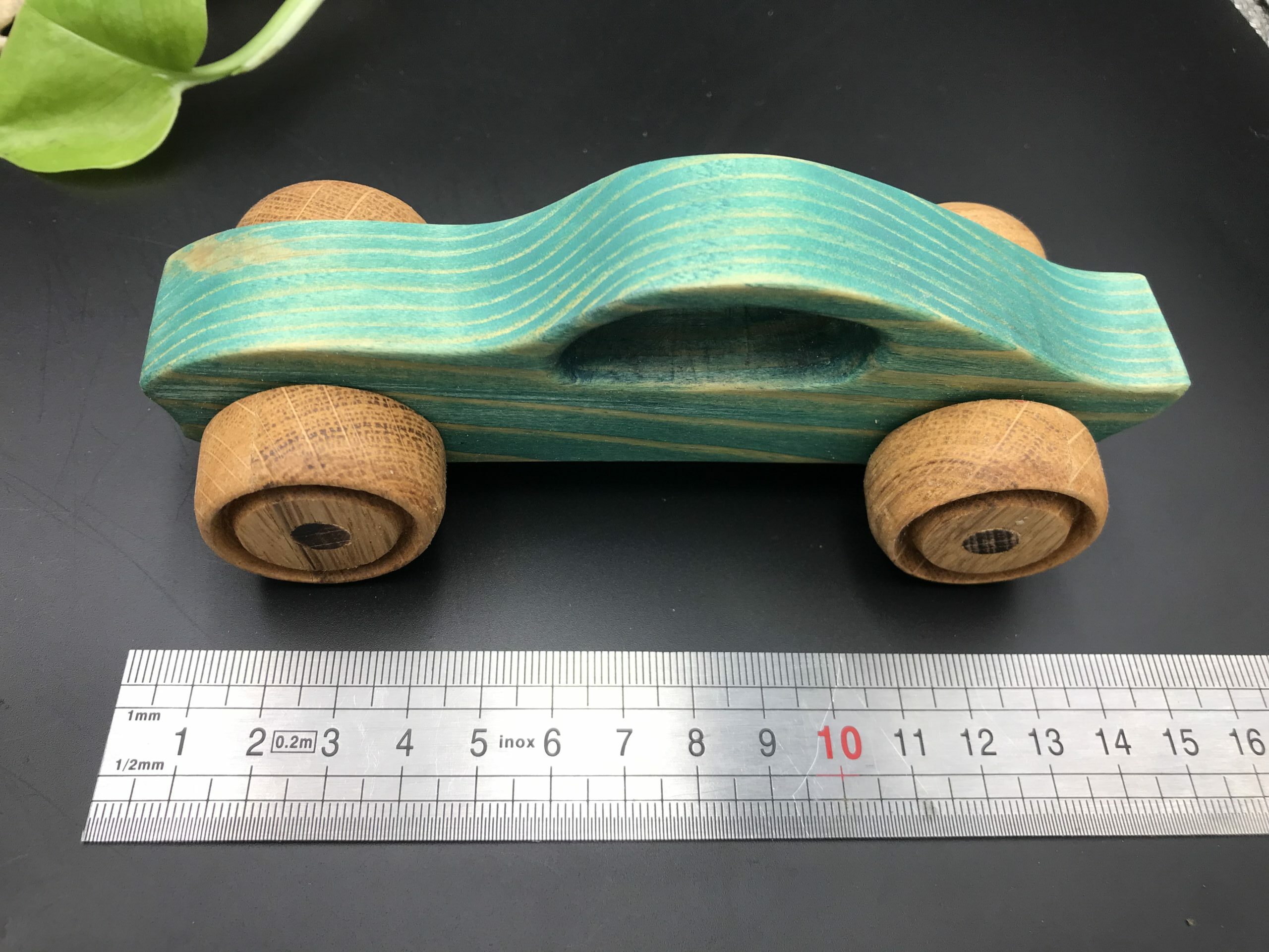 Cette voiture en bois est fabriquée avec des bois de récupération.
