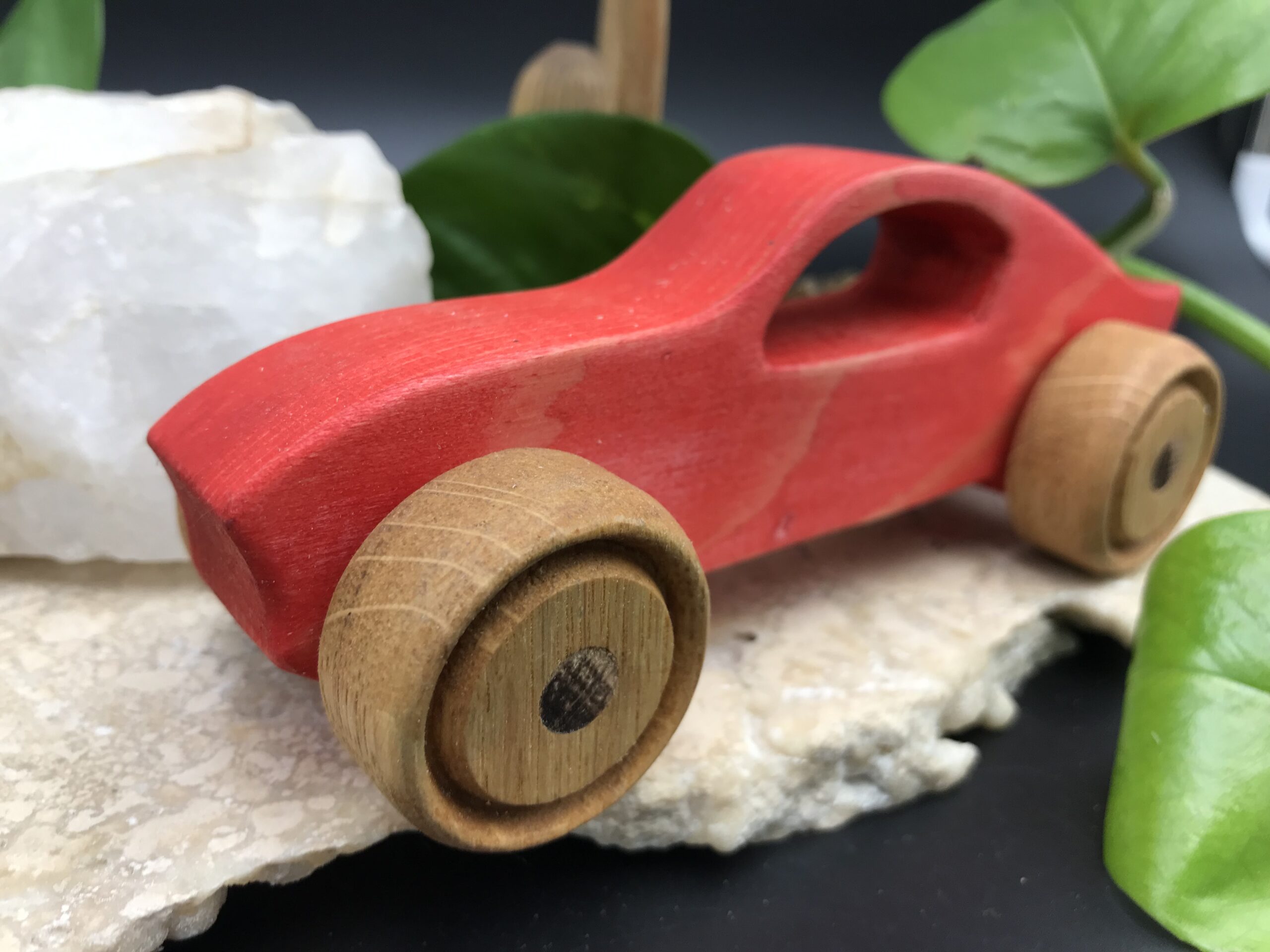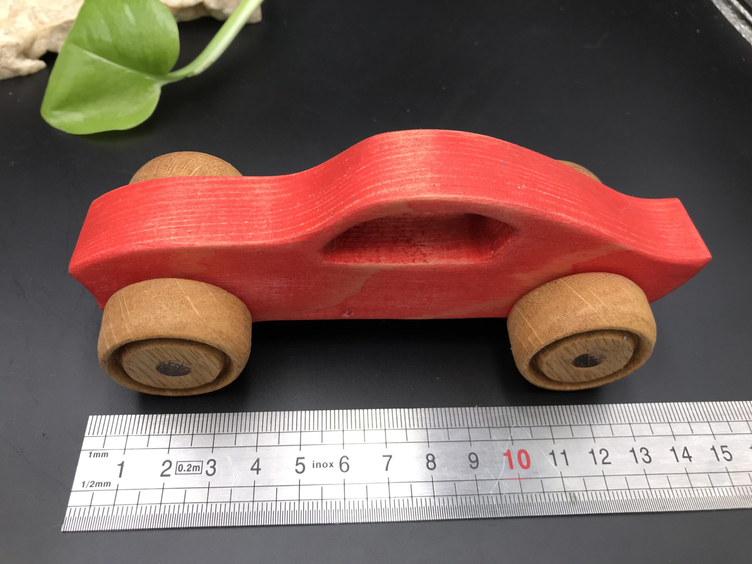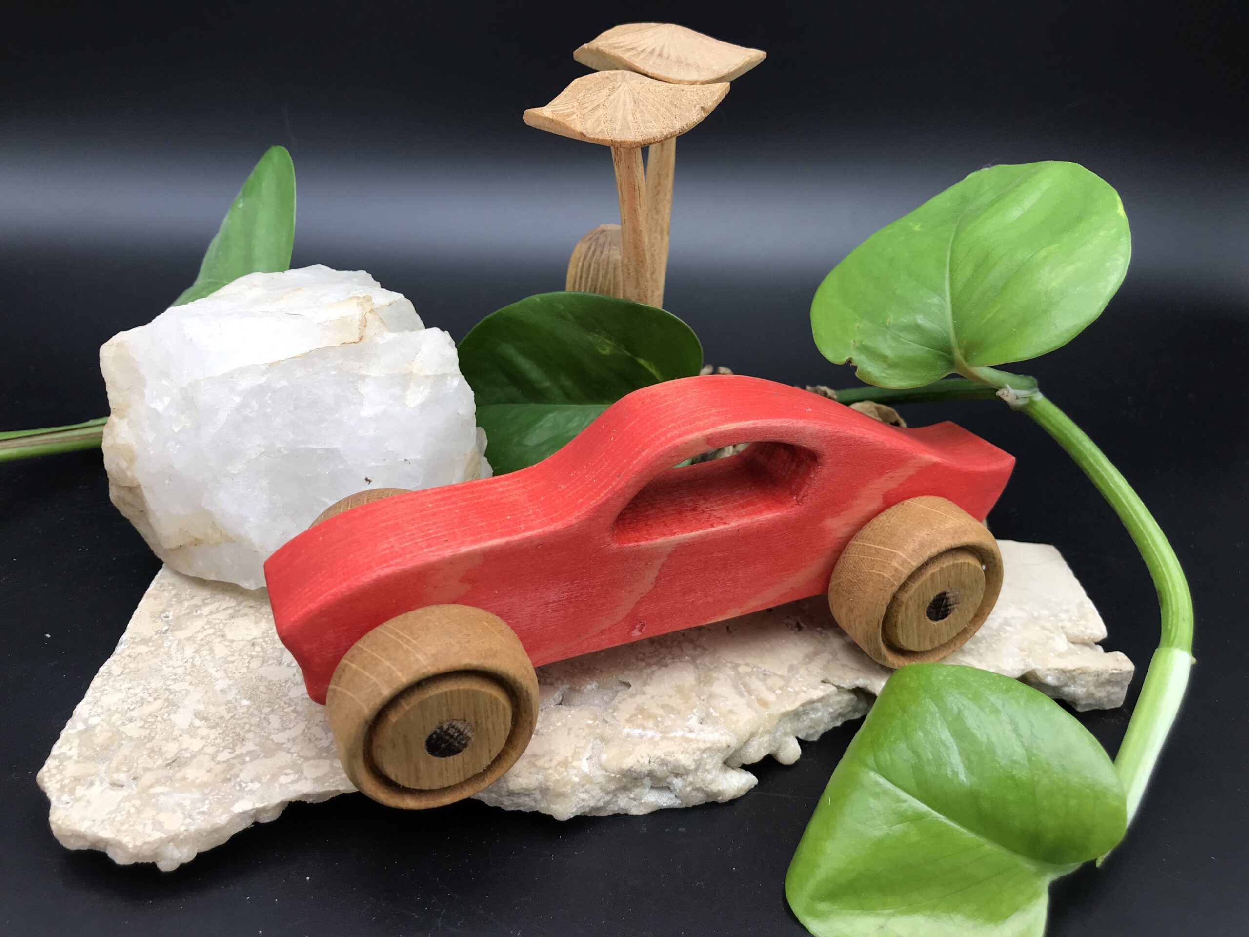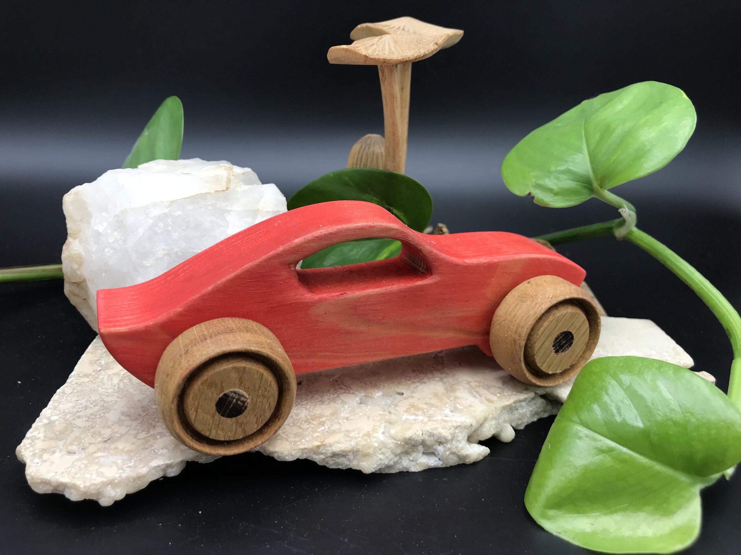 Cette voiture en bois est fabriquée avec des bois de récupération.
