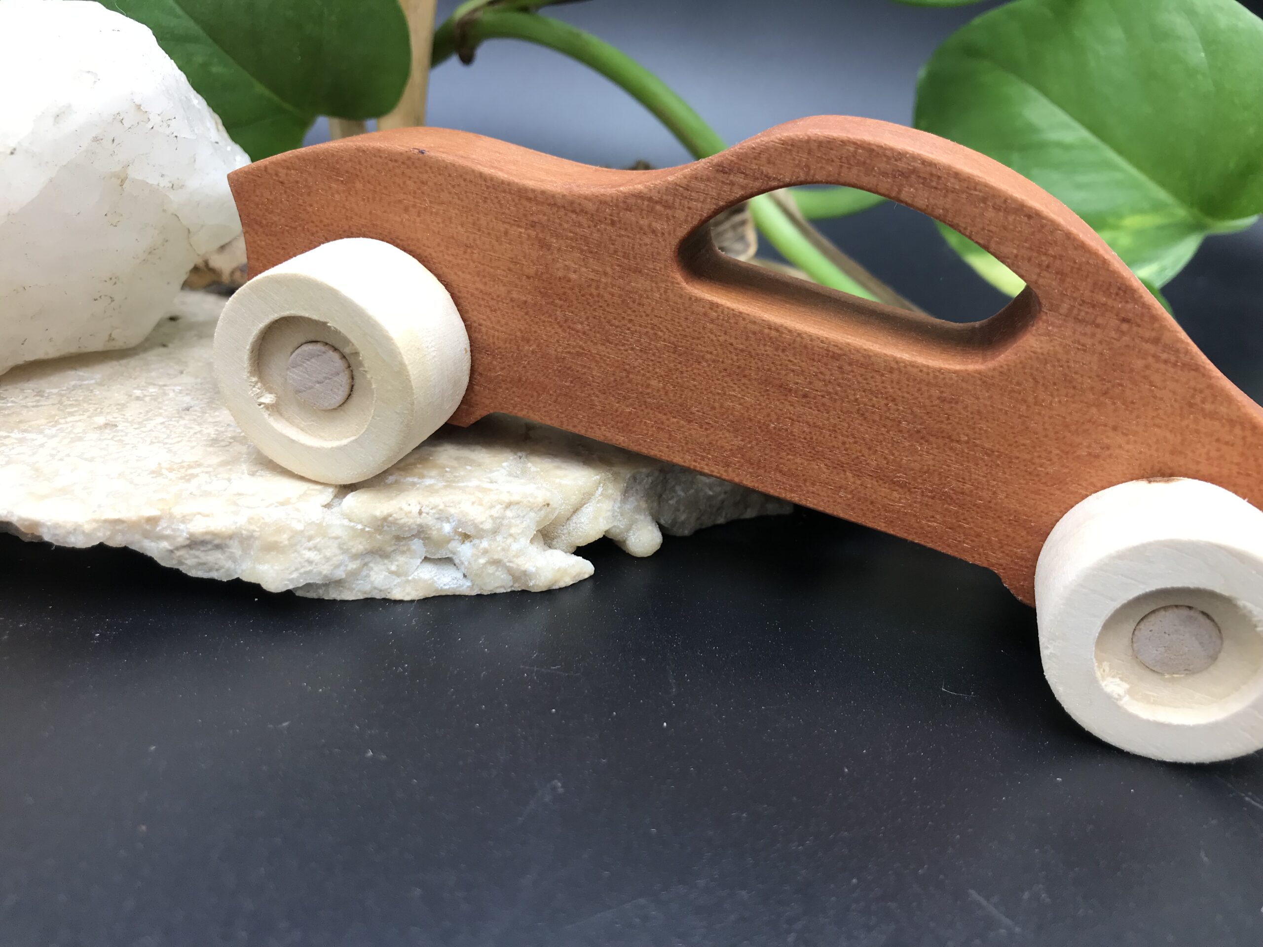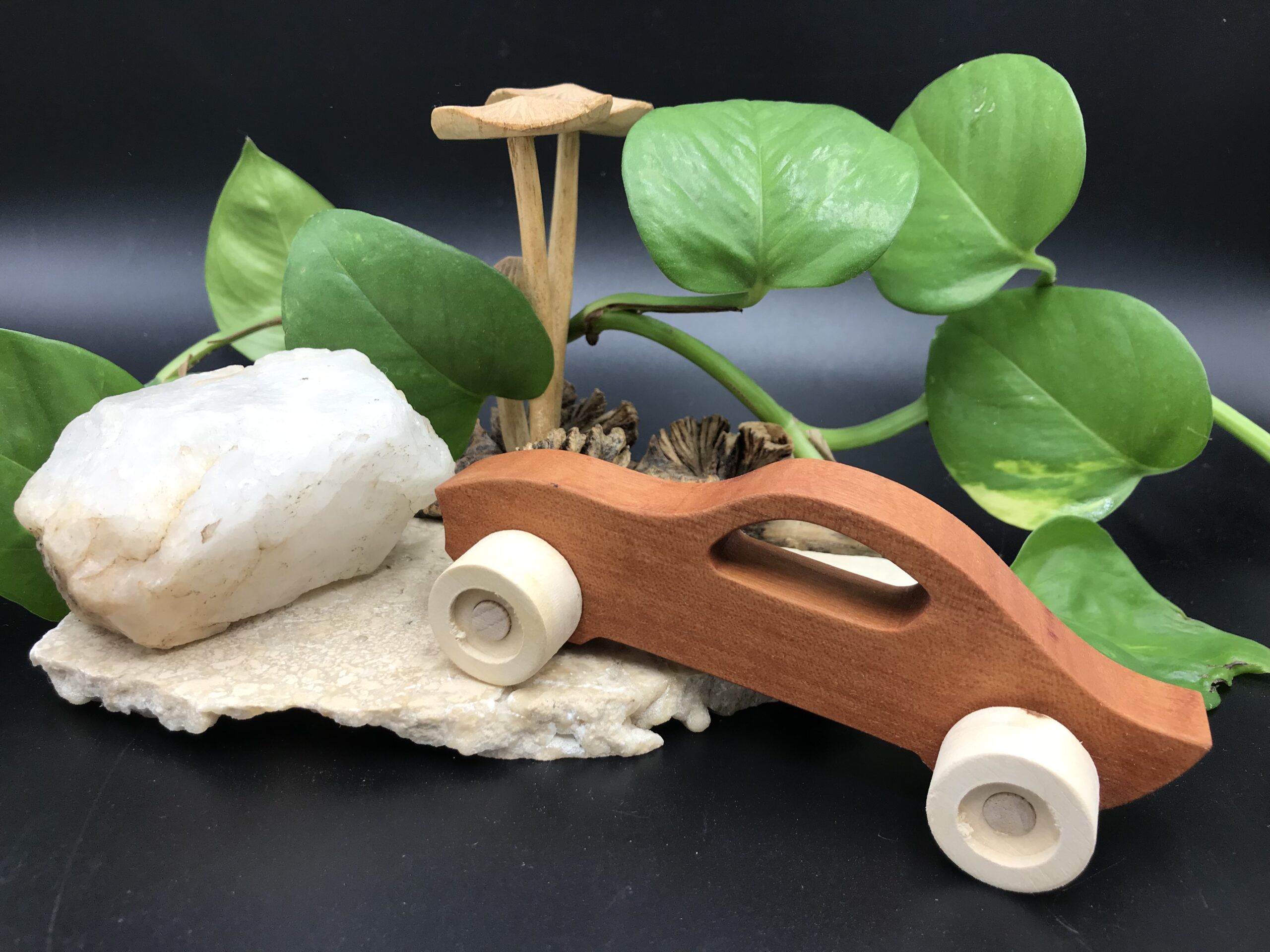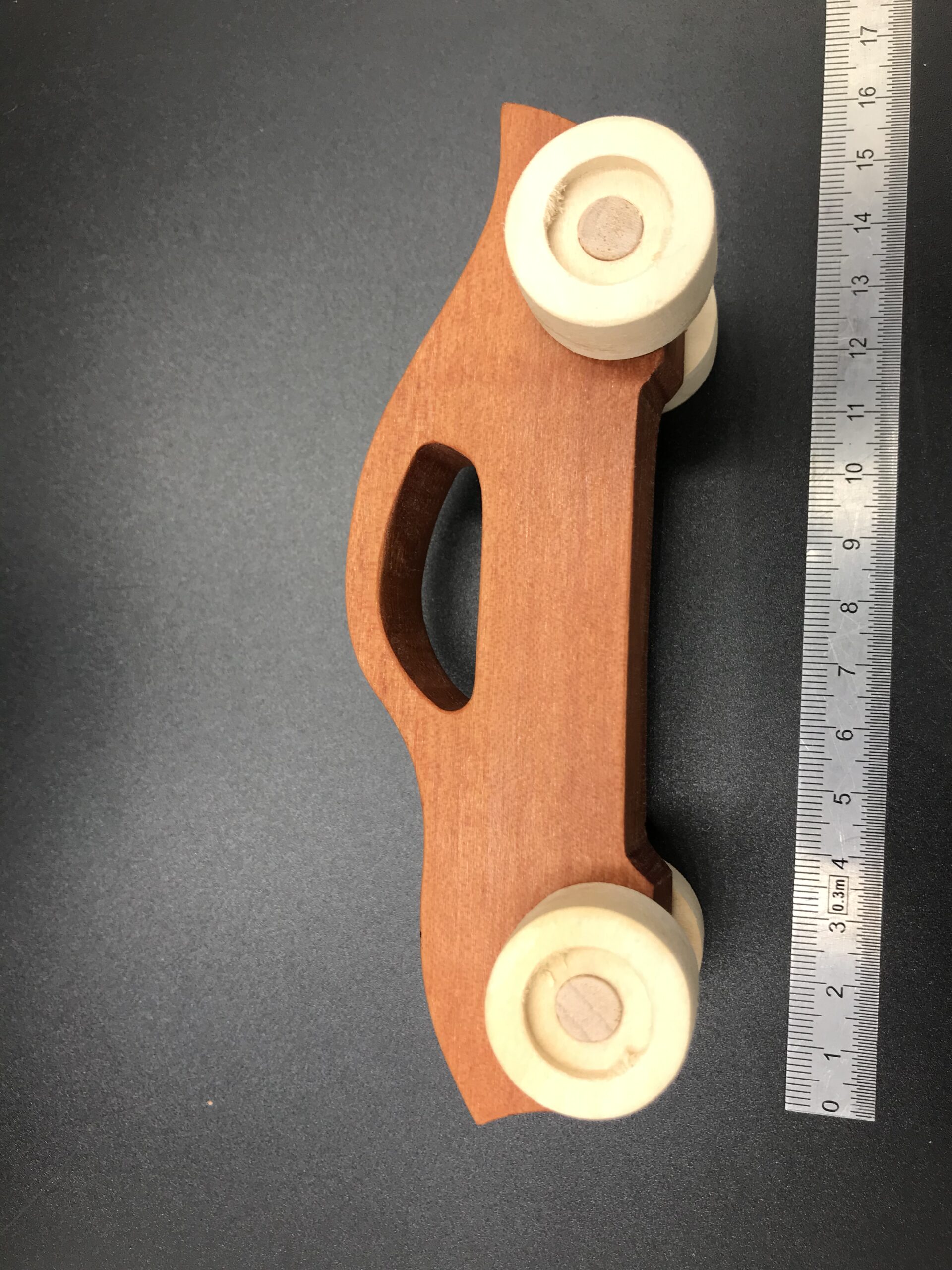 Cette voiture en bois est fabriquée à partir de bois de récupération. Elle a été découpée manuellement à la scie à chantourner