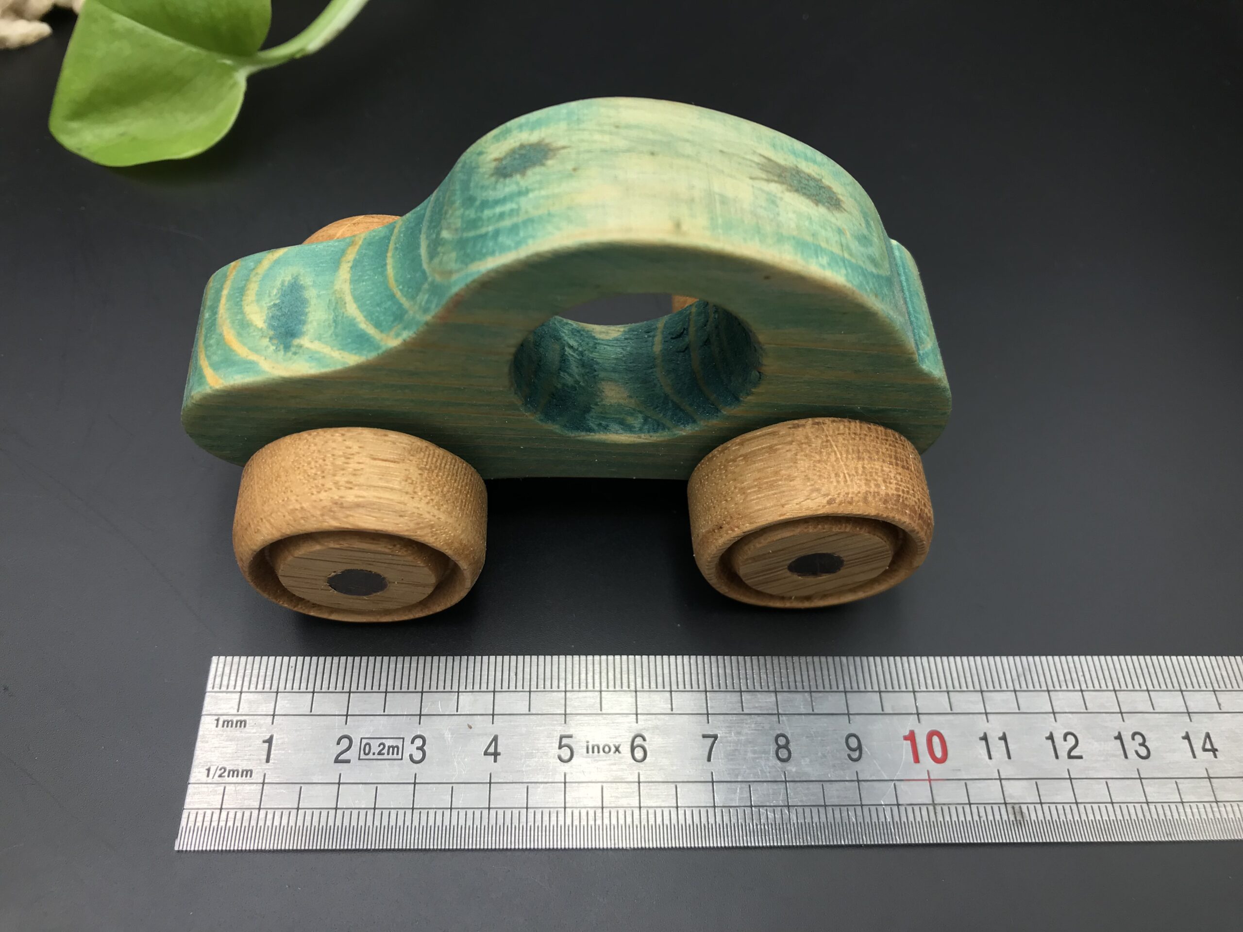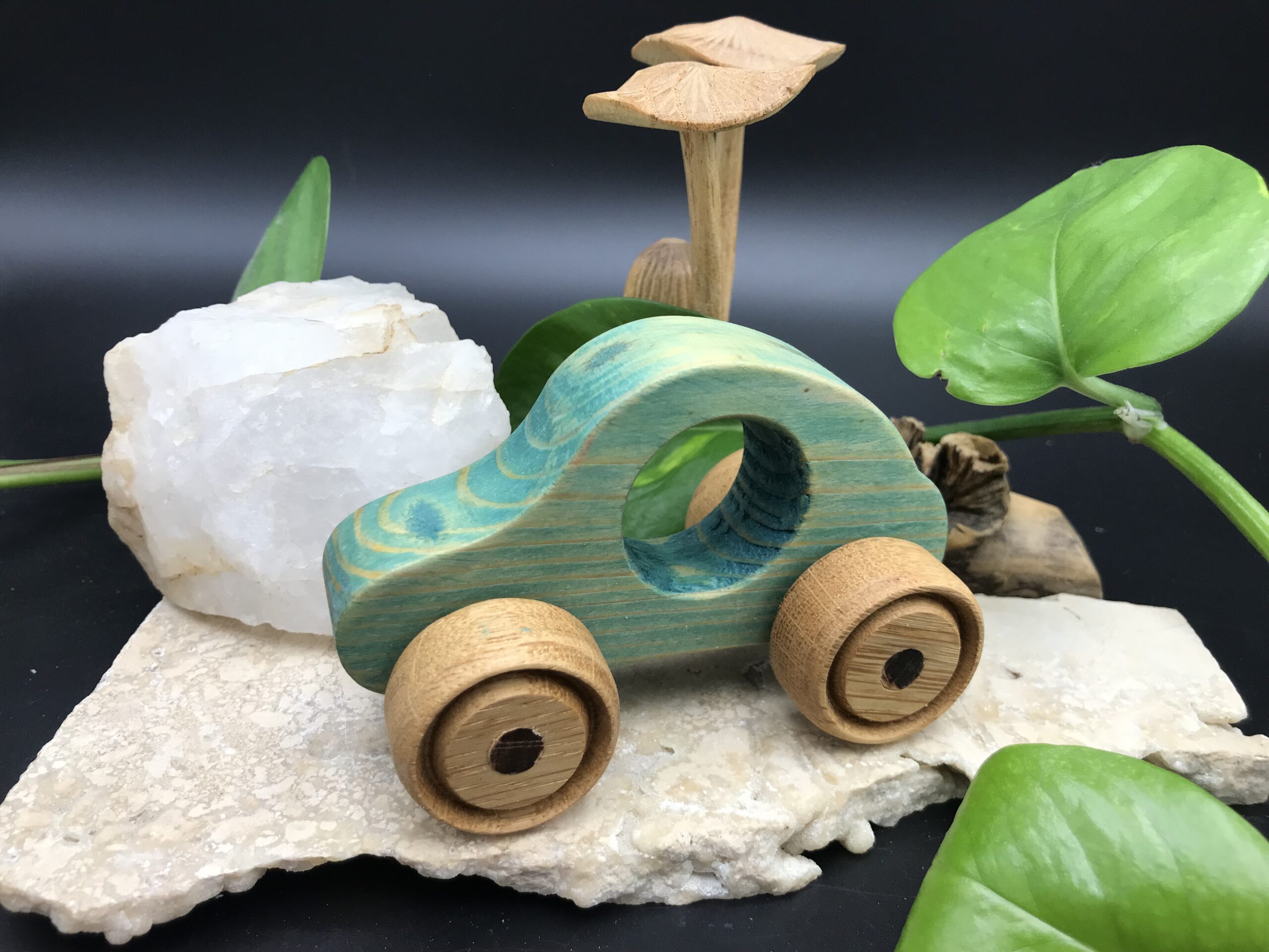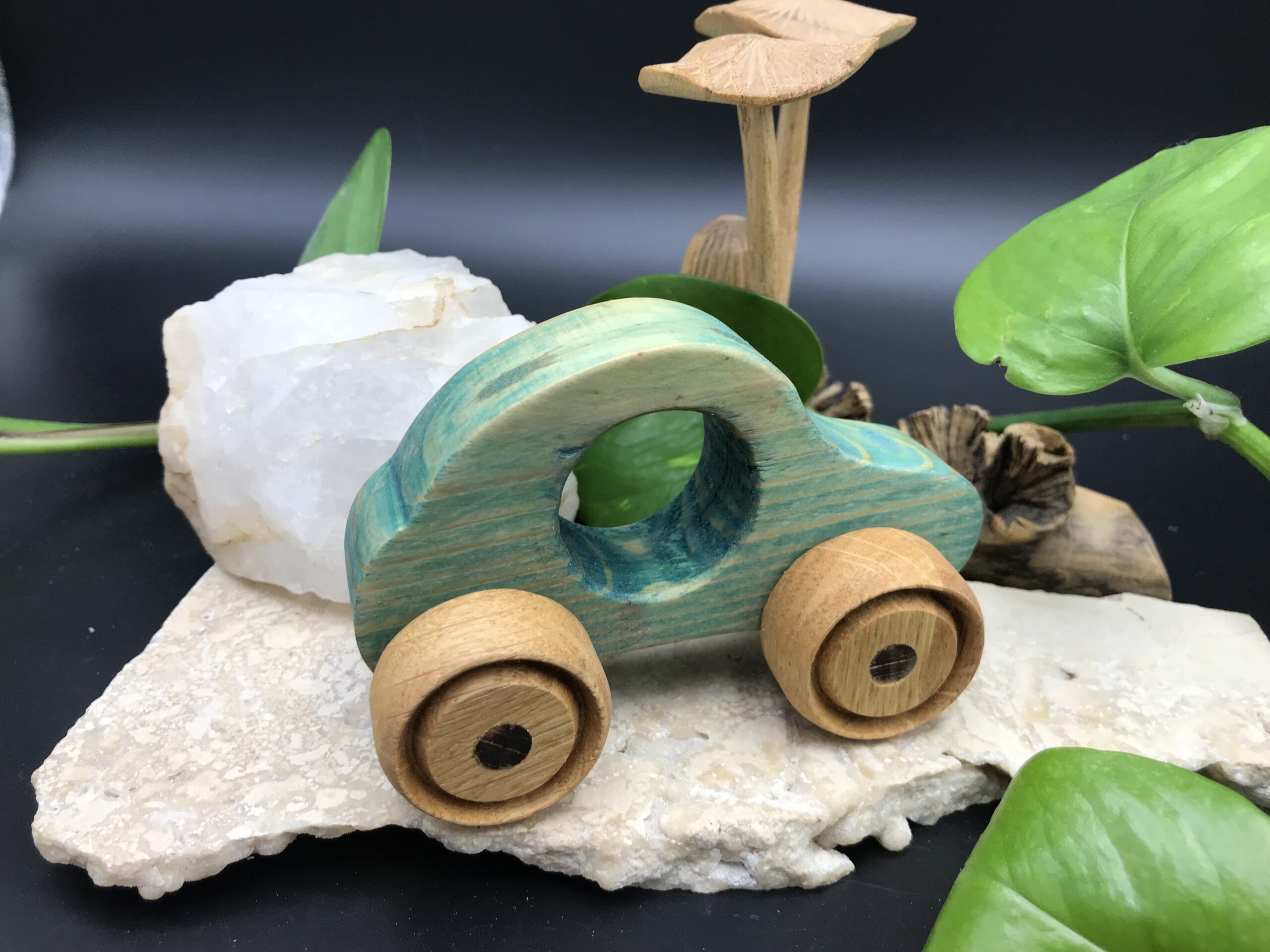 Cette voiture en bois est fabriquée avec des bois de récupération.