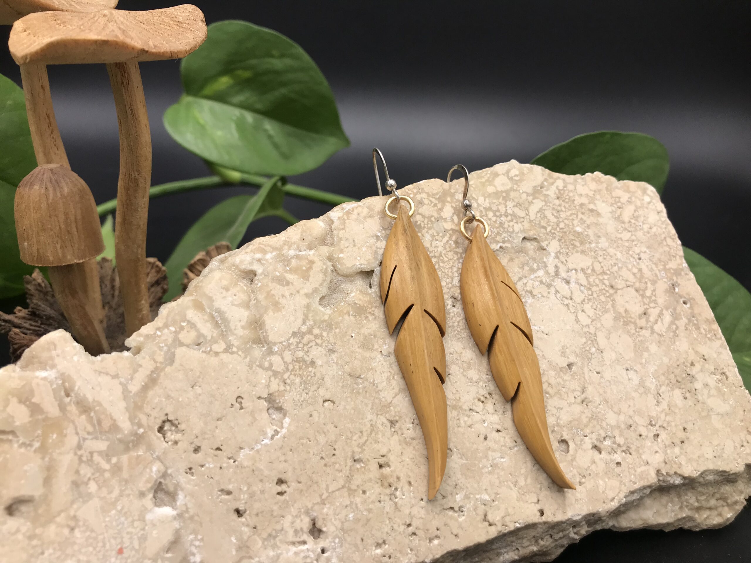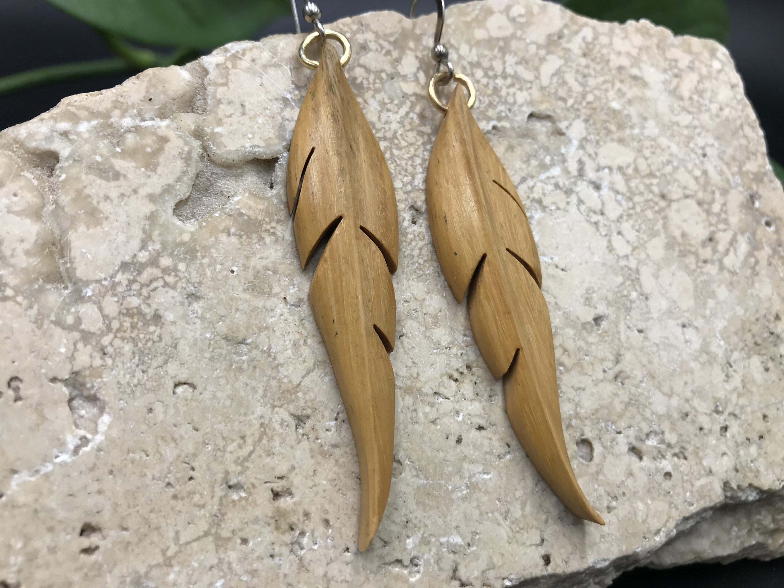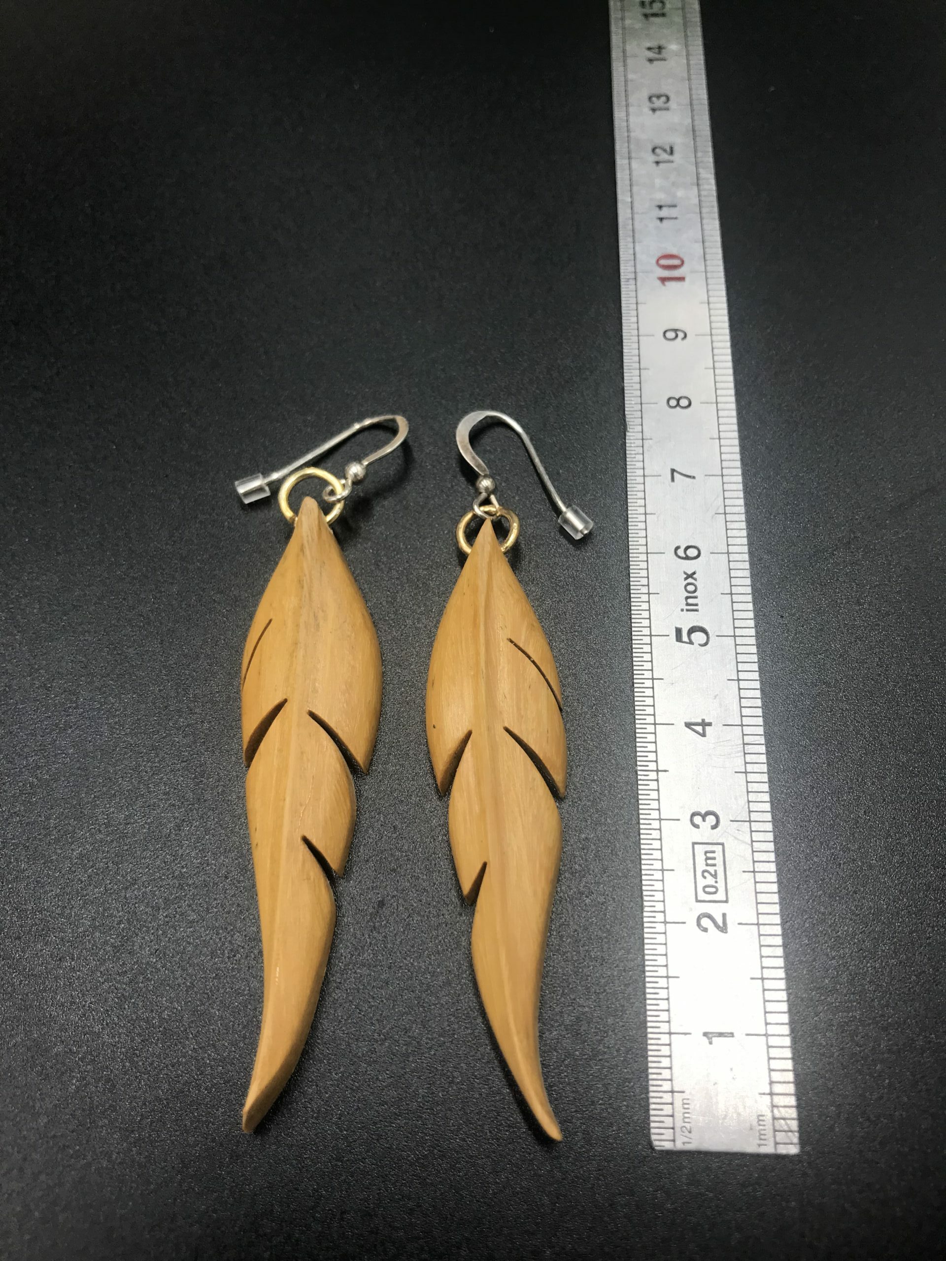 Ces boucles d’oreilles sont découpées à la main au bocfil et sculptées au Dremel.