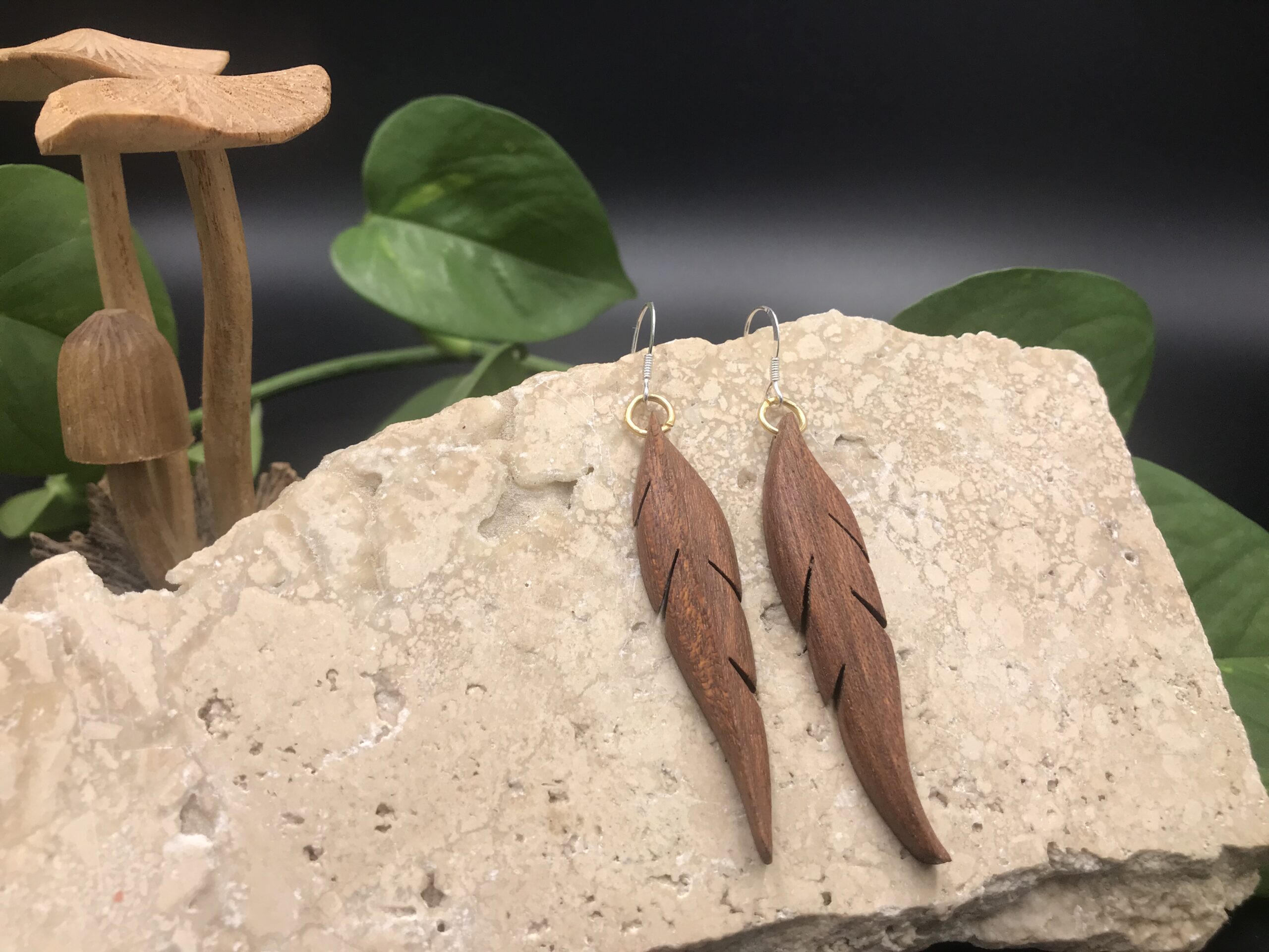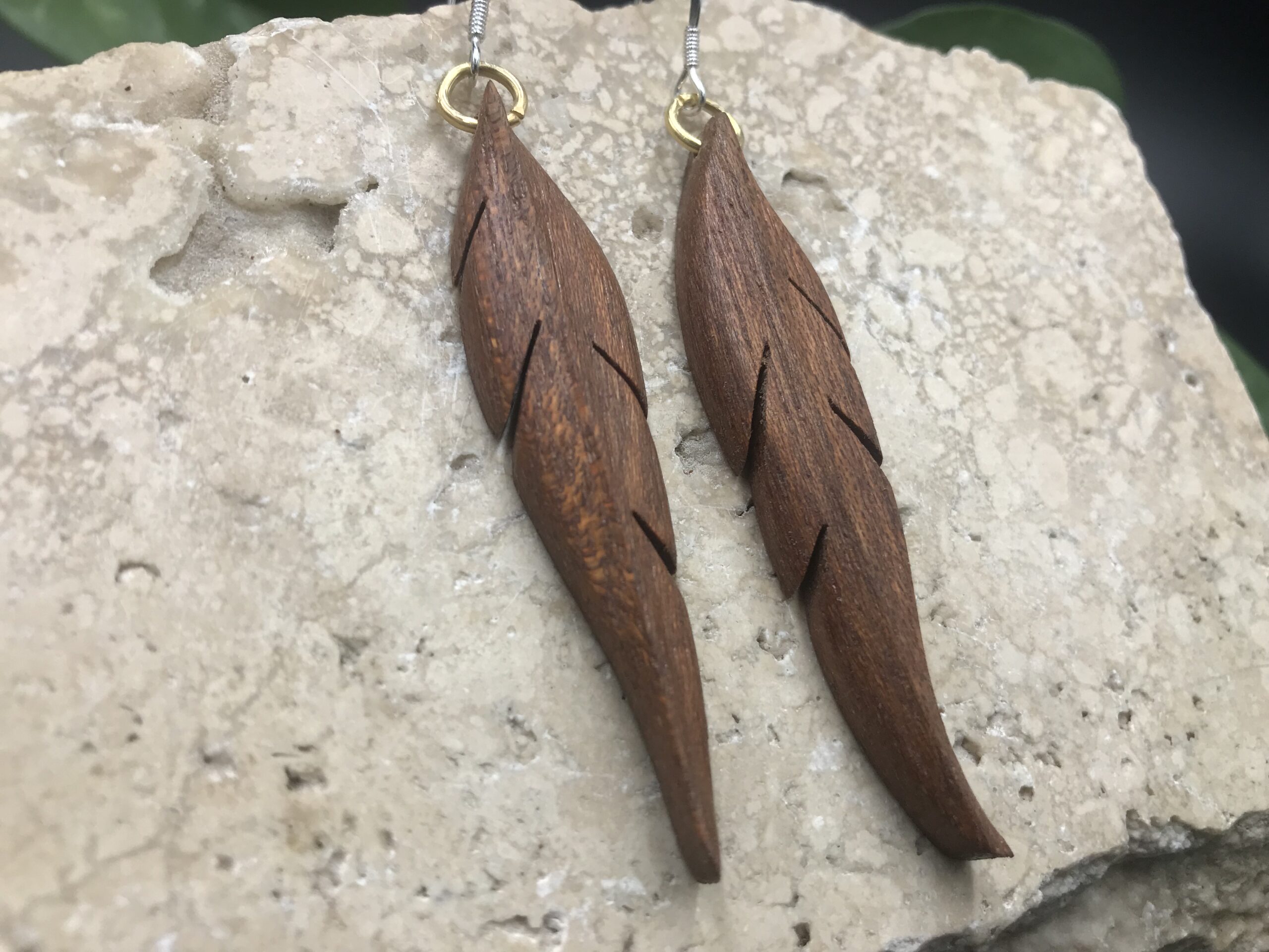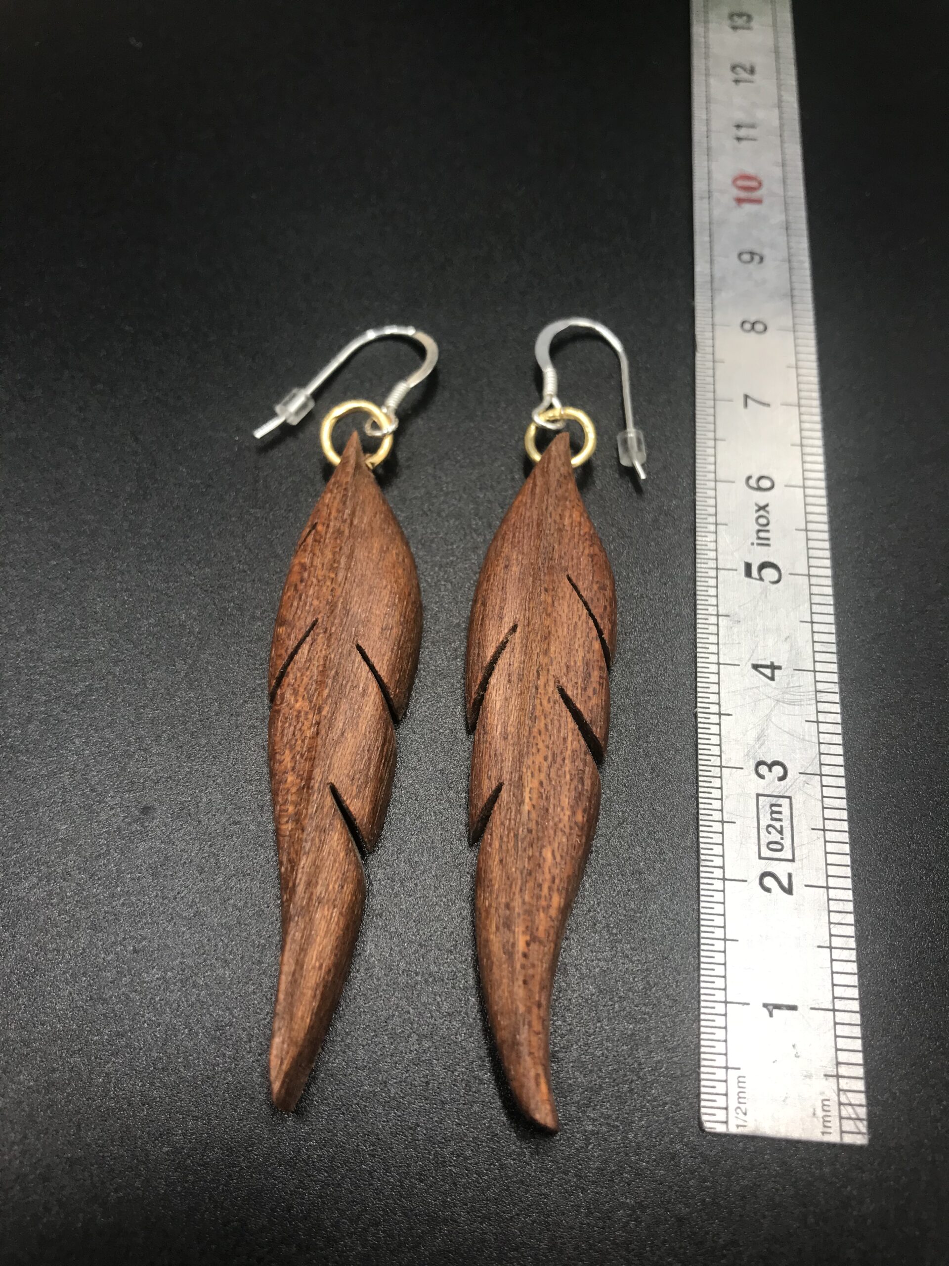 Ces boucles d’oreilles sont découpées à la main au bocfil et sculptées au Dremel.